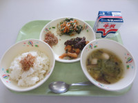 【今日の給食:ご飯、レタスの中華スープ、元気がでるレバー、ナムル、じゃこふりかけ、牛乳】